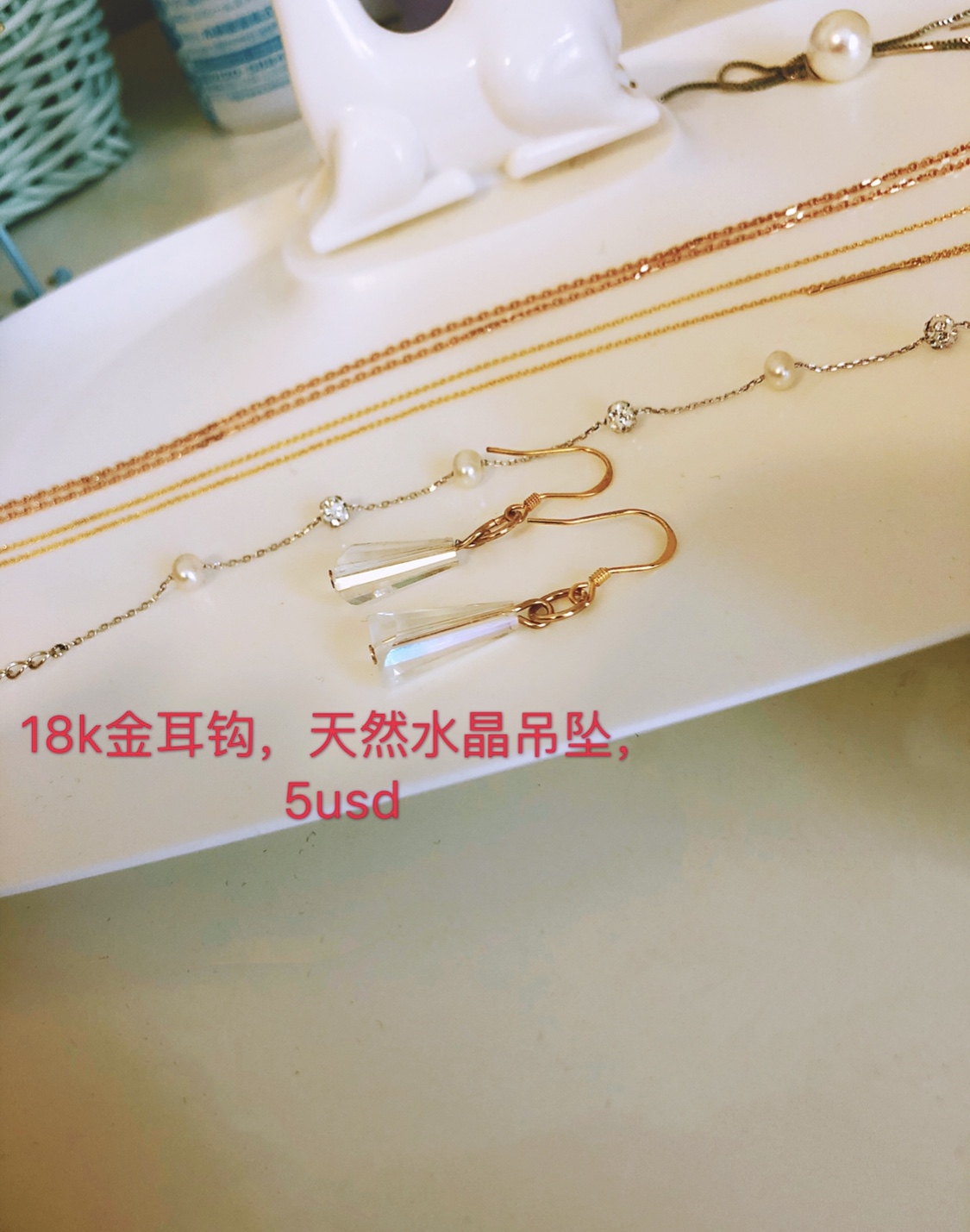一对非常美的耳环,18k金耳钩,天然水晶吊坠