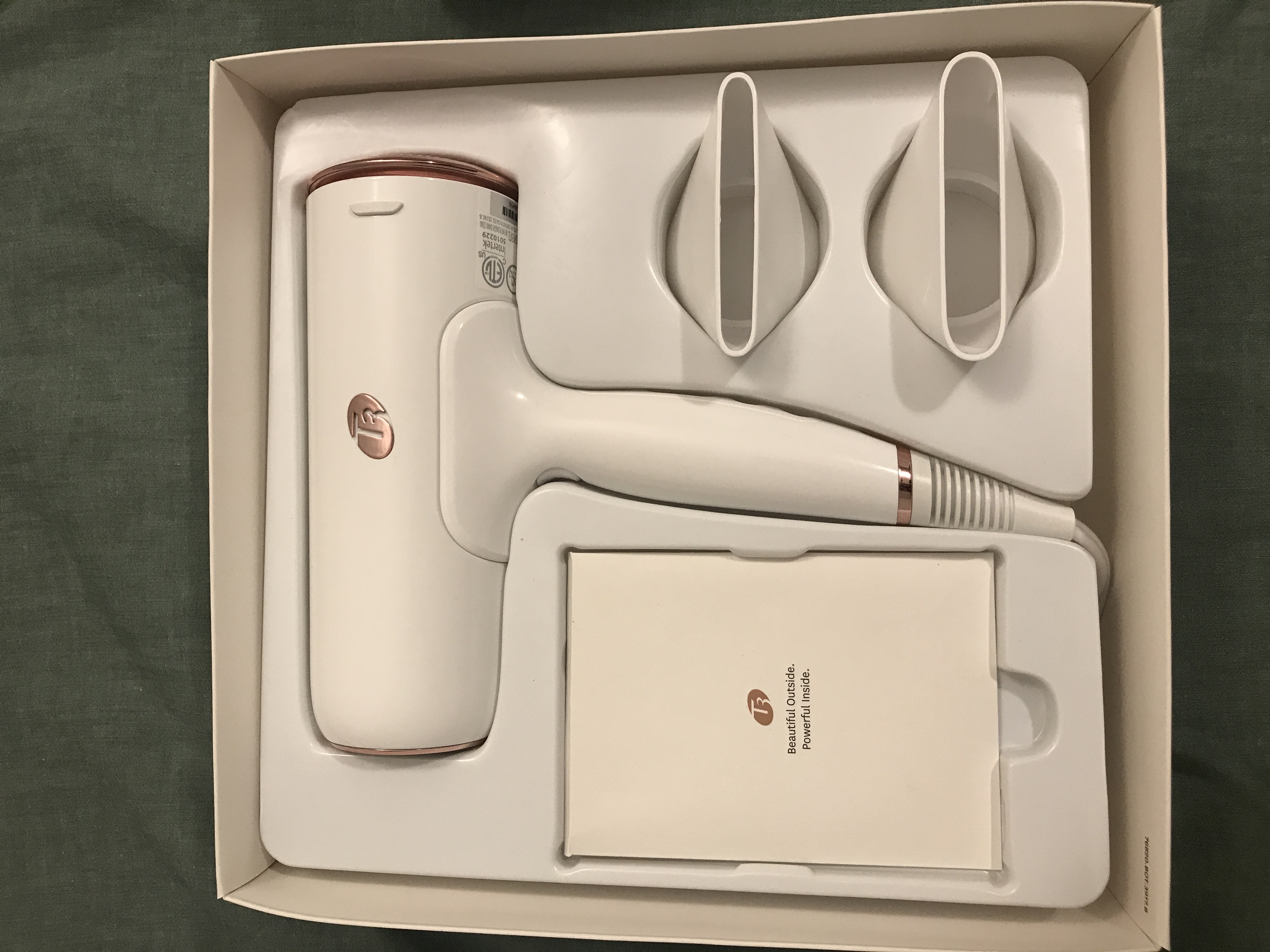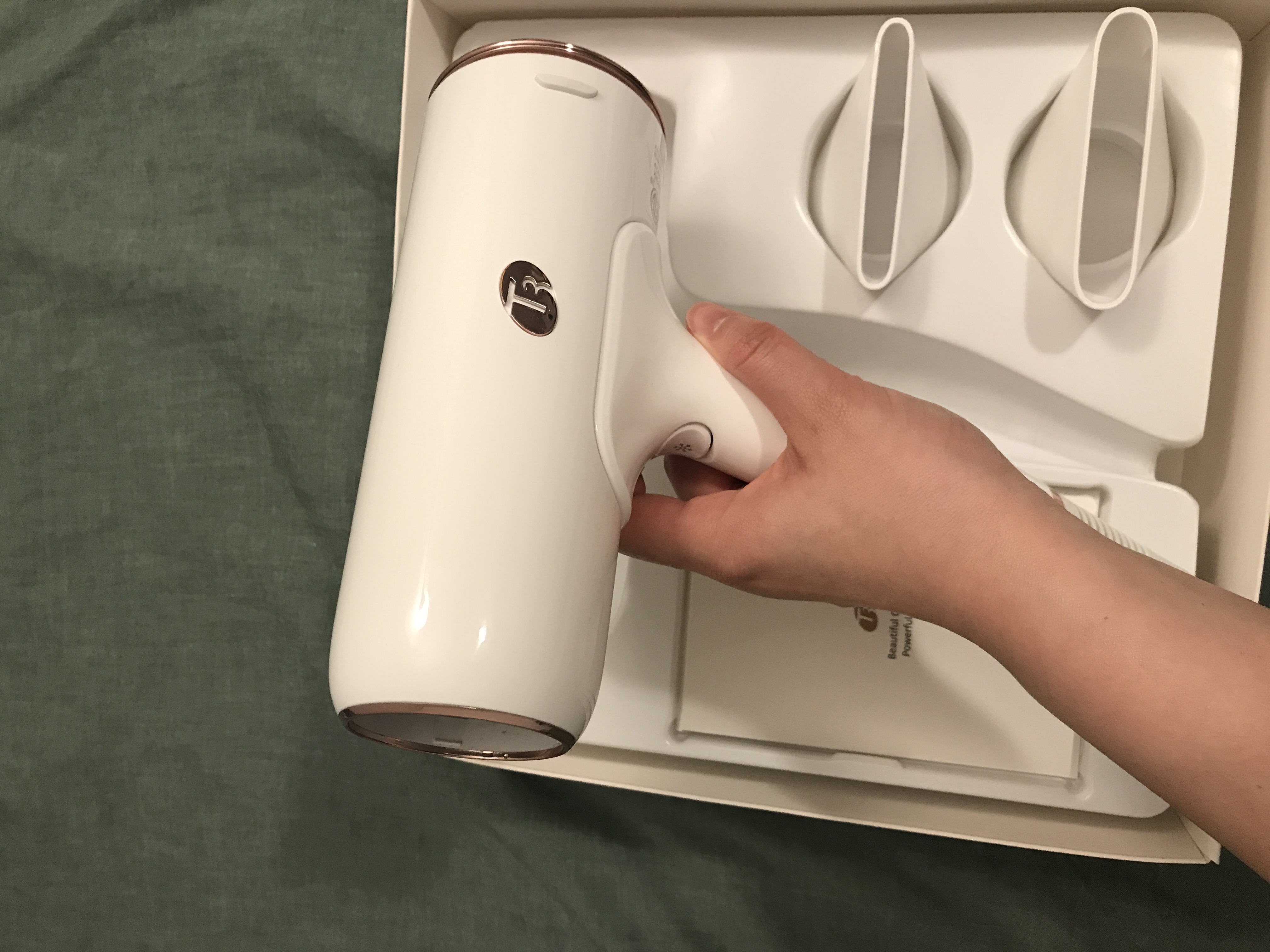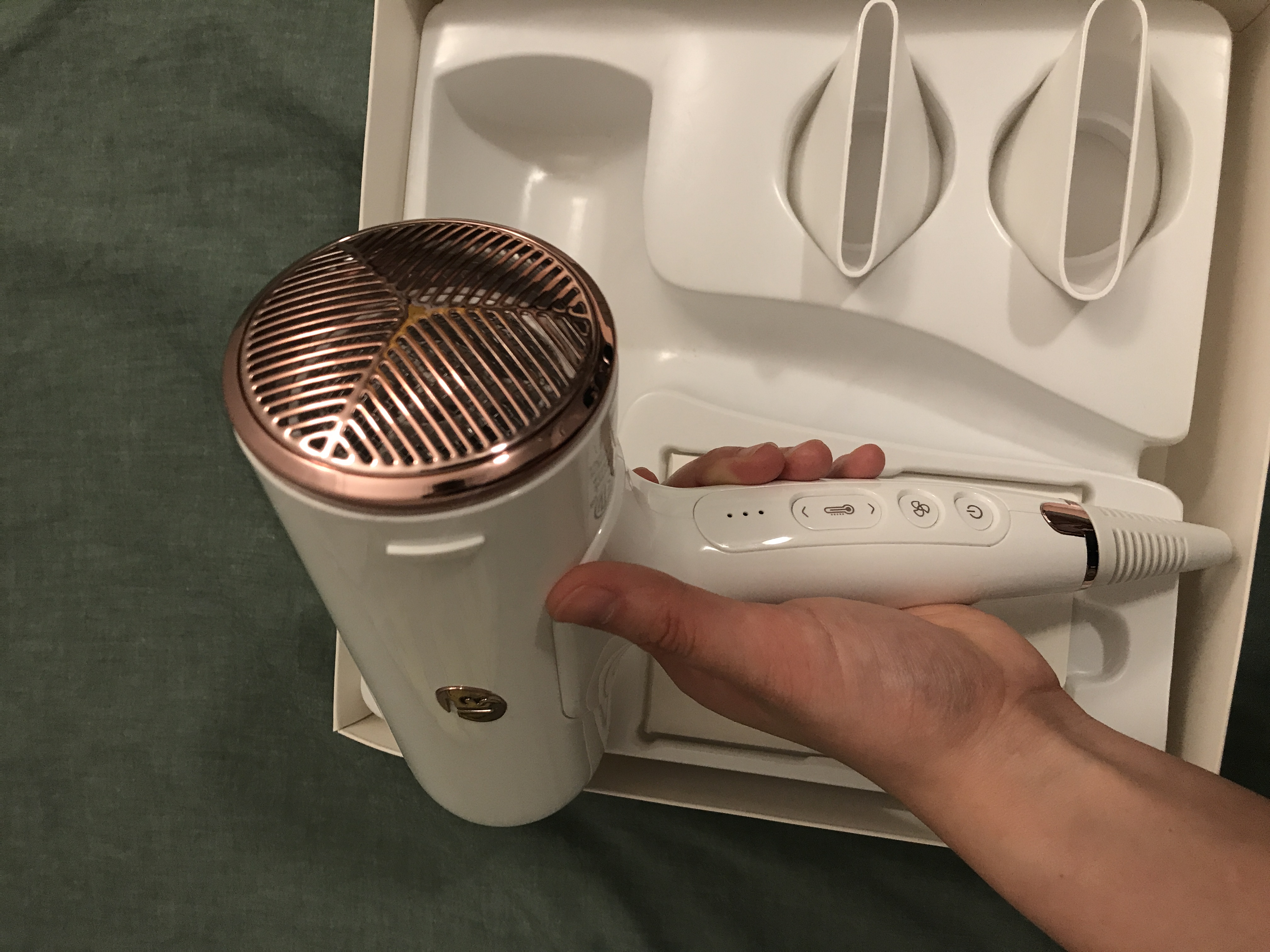 说明书包装盒都在,颜值高,快干,三档温度,一秒冷风,吹再久温度再高机身也不烫手。