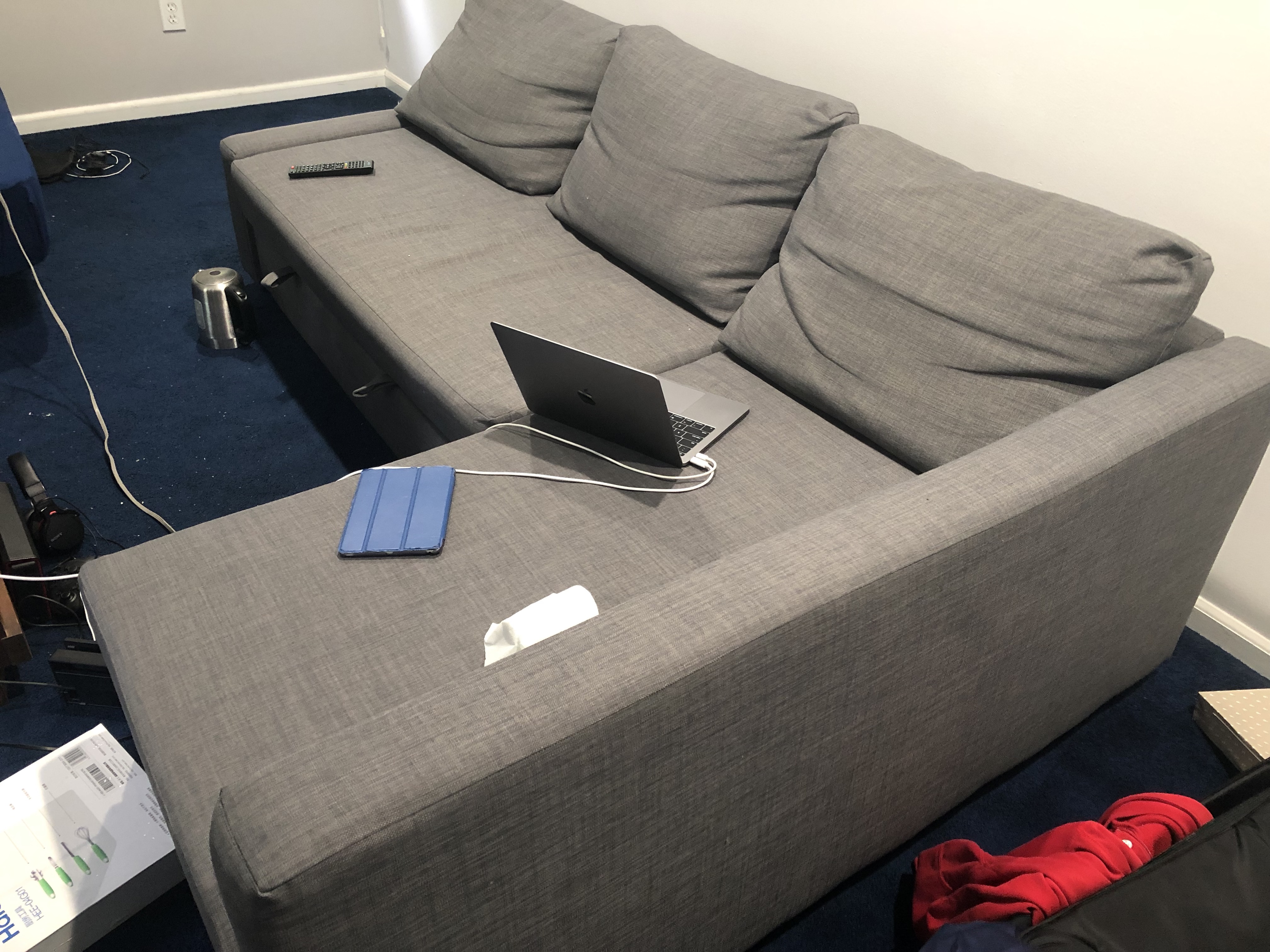出售L形沙发一个,如下图。也可以展开成为一个方形沙发床。同时,沙发内部还可以作为储物柜使用。简洁大方,实用性强。尺寸大约230cm*150cm。因即将搬家,故仅售80$。搬运自理(可分块拆卸,用一个中型的van即可运走)。