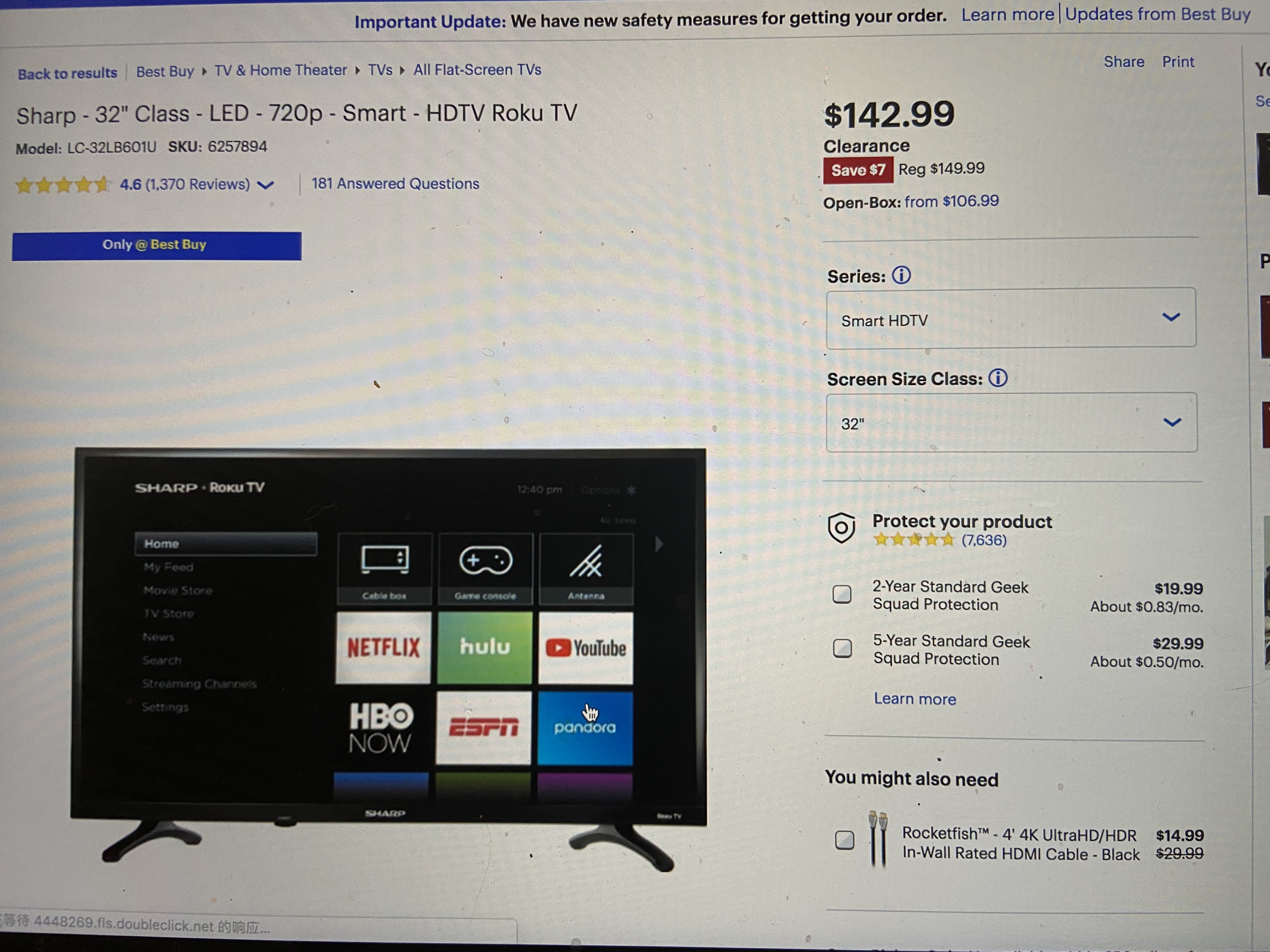 7. sharp 32寸 HDTV Roku TV 40刀