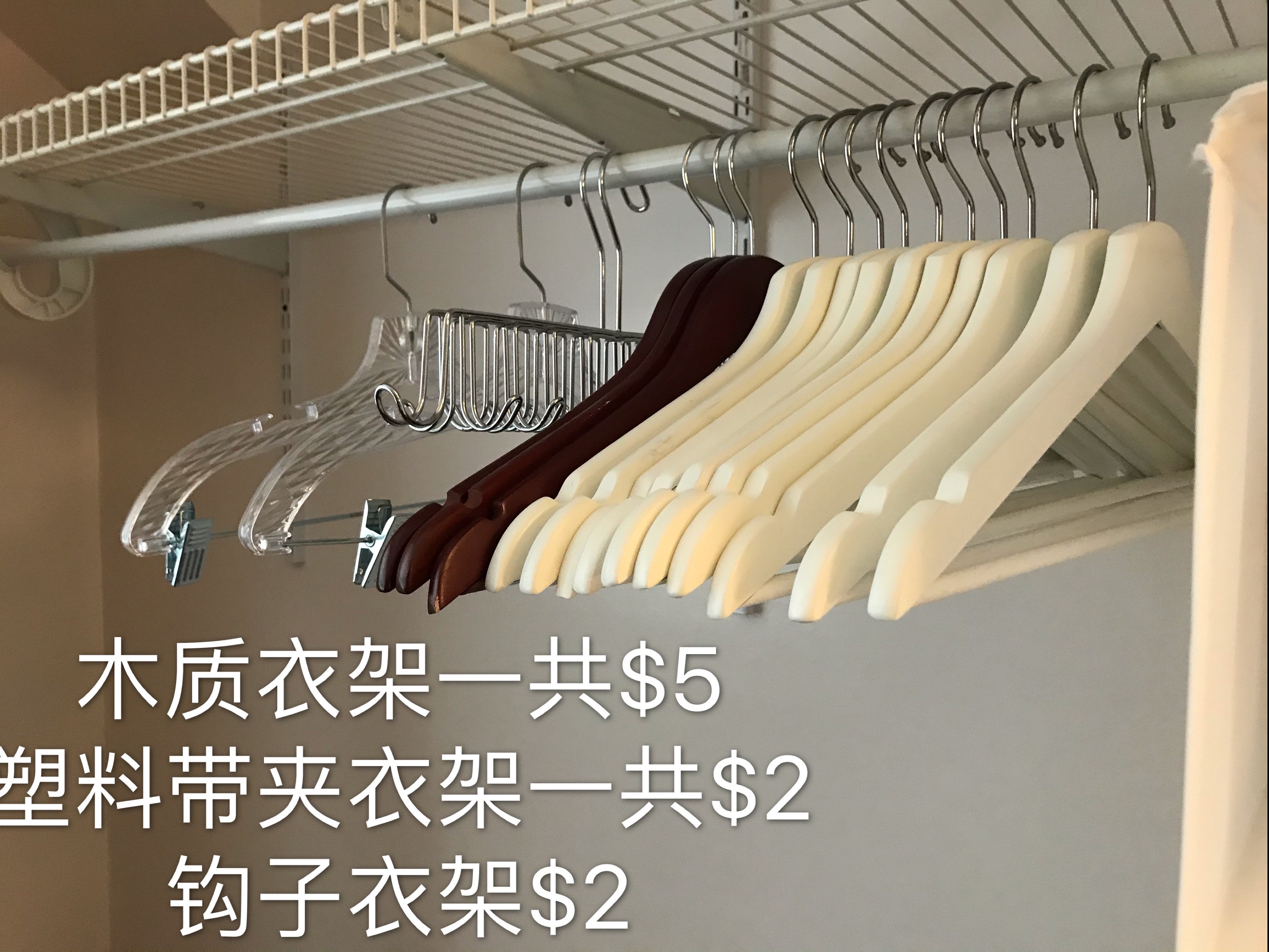 白+黑木质衣架一共$5、塑料衣架一共$2,钩子衣架$2