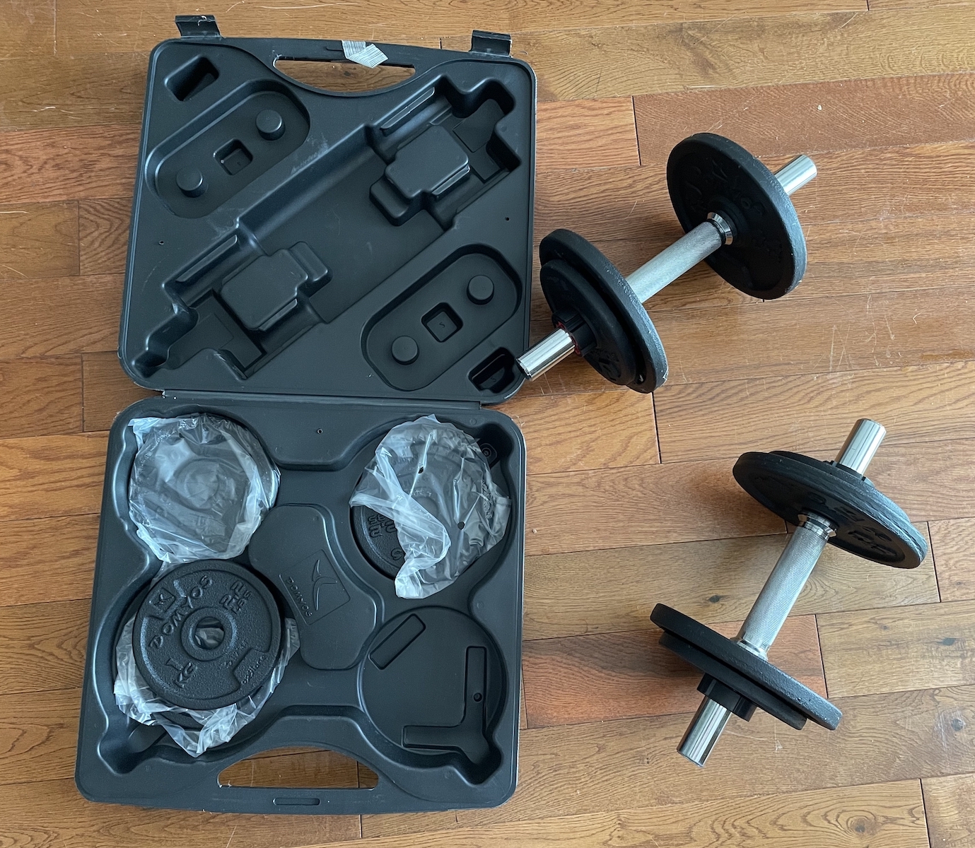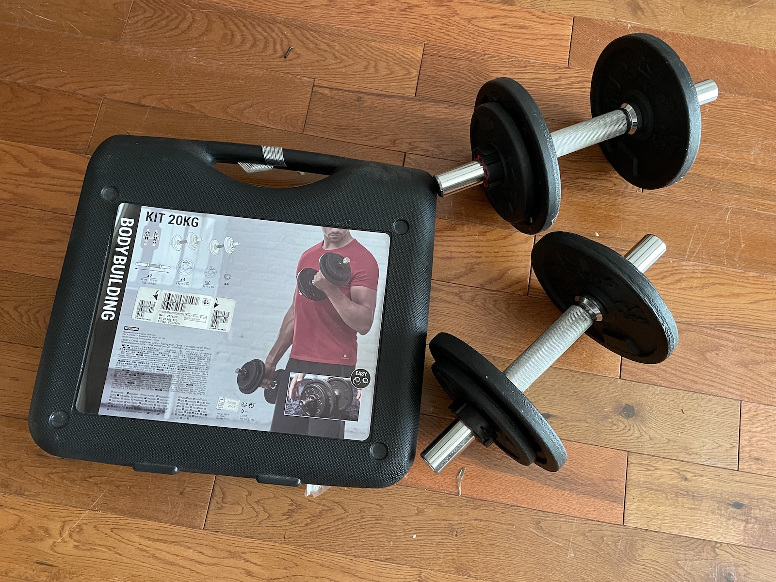 [已卖出]【多种配重健身杠铃】:20 kg不同重量随意组合,可与健身椅完美配合来运动。98成新,仅卖 $39, 欲购从速!