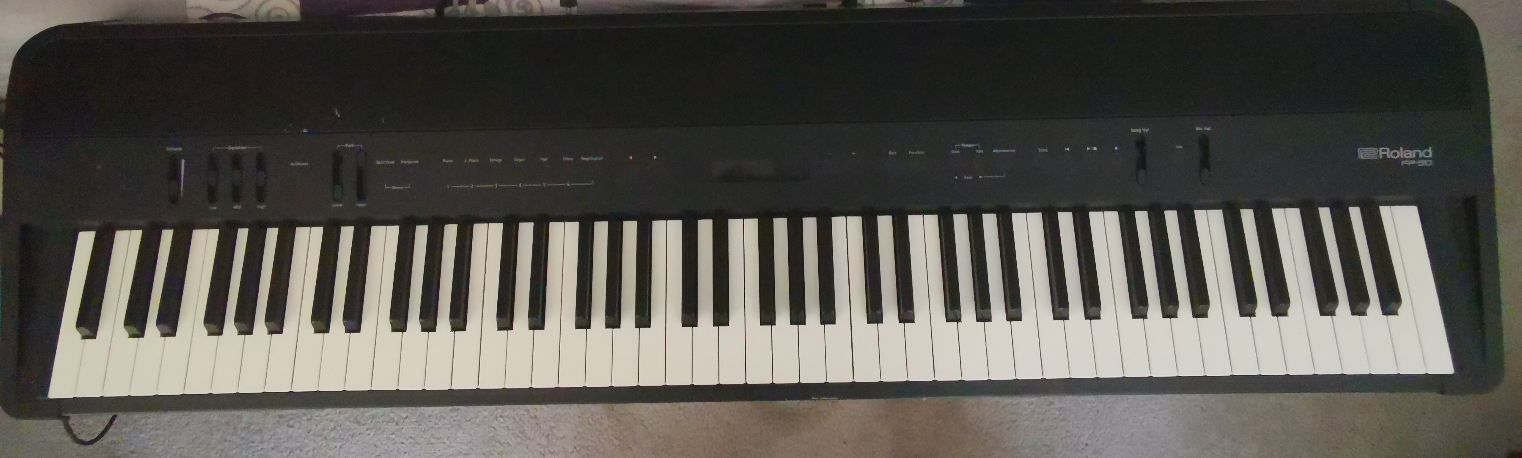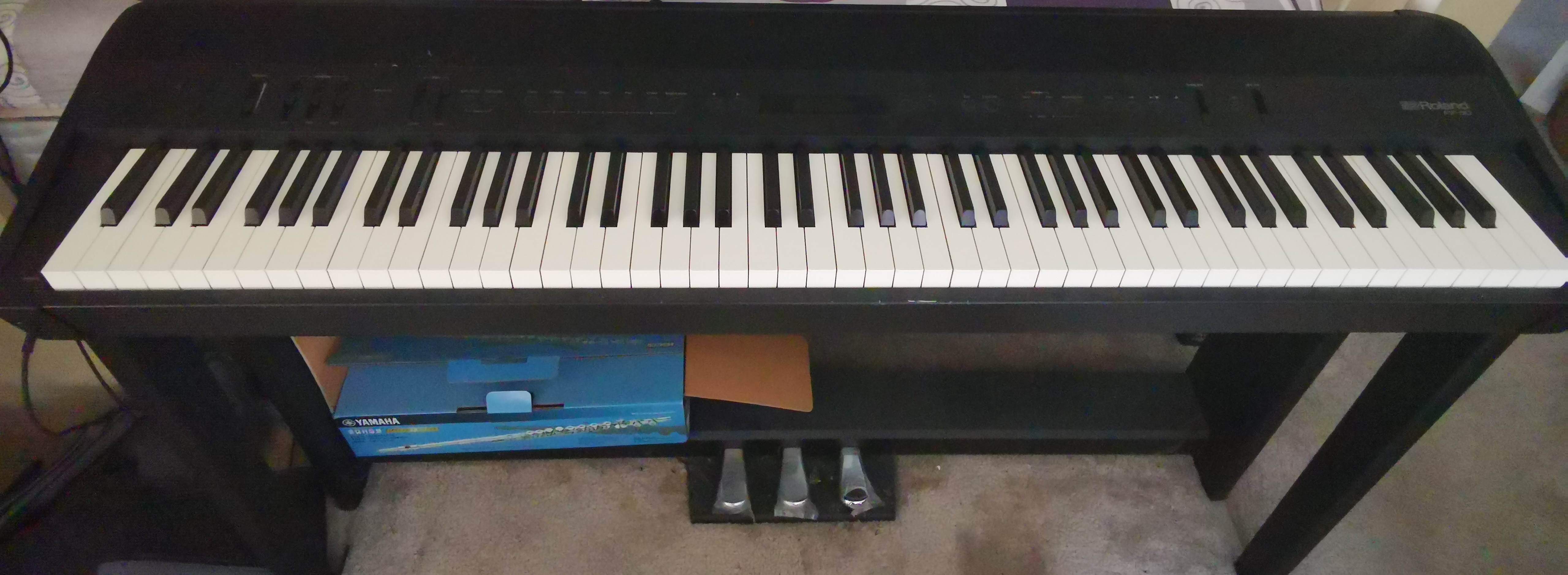 罗兰FP90, 罗兰公司2017年的旗舰便携式钢琴,全键盘配重,原价2000刀(算上下面的架子,三踏板和琴凳)现在回国便宜卖了。(当然你也可以考虑后继型FP-90X)