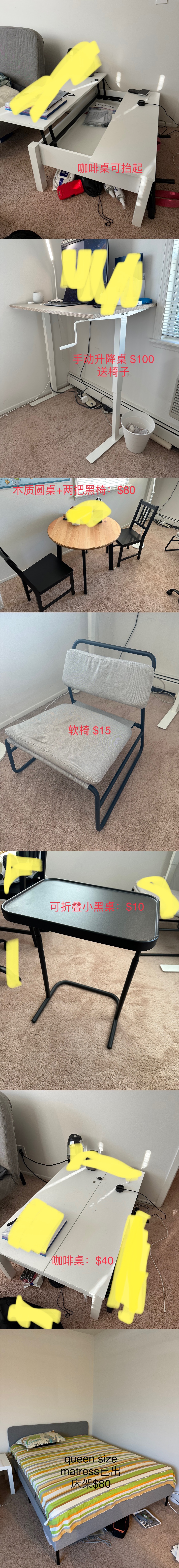 本人因为搬家现将所有家具出售。所有家具均购置于去年12月。有床、沙发床,升降桌,小圆桌,咖啡桌,书柜等。需自提,位置 Port Jefferson Heatherwood Apartment。大件视情况可以帮忙拆卸。后附原价及链接。