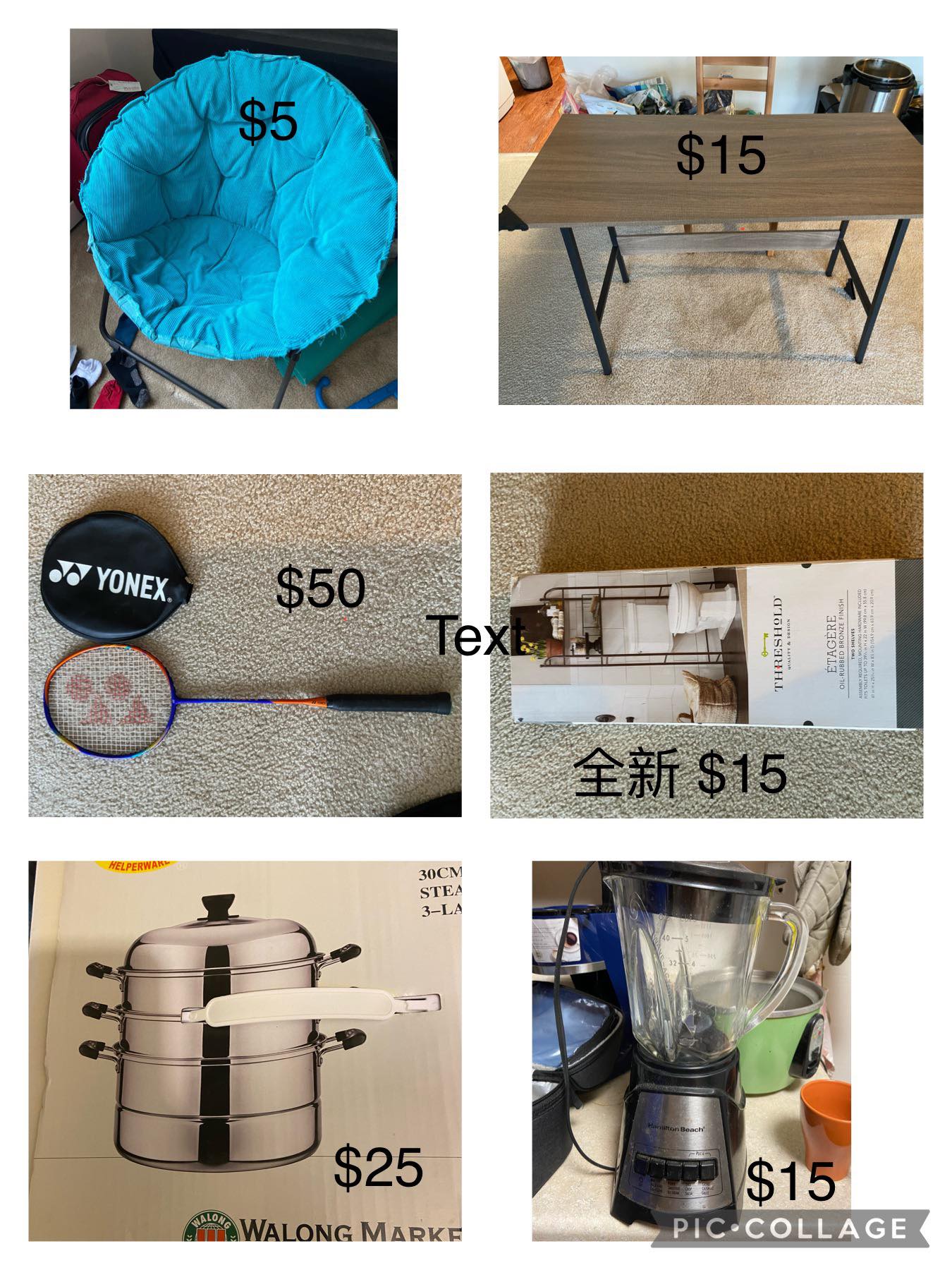 毕业搬家出清,可学校交易或Port Jefferson 自取。联系6262159900,可小刀。