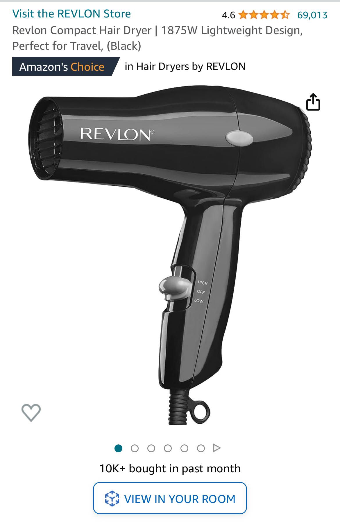 Revlon Compact Hair Dryer | 1875W Lightweight Design, Perfect for Travel, (Black)