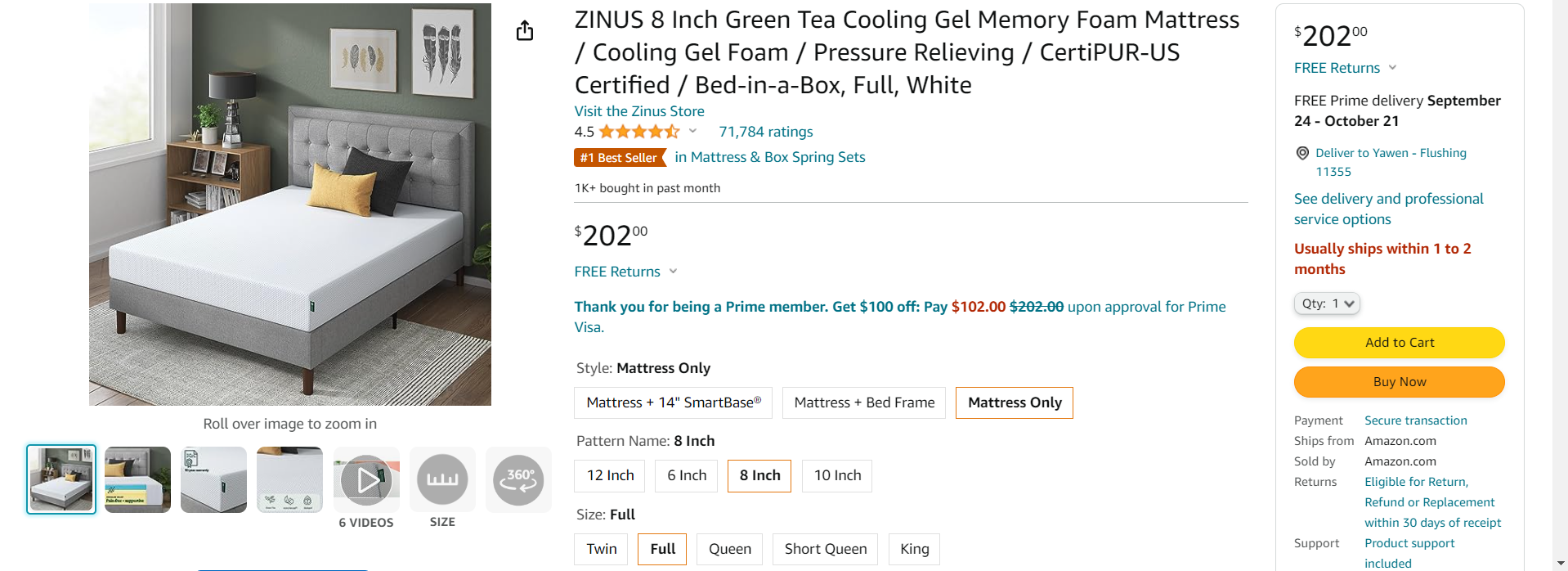 出闲置zinus fall 记忆床垫 8 inch 买了半个月左右 stony brook!!!!!