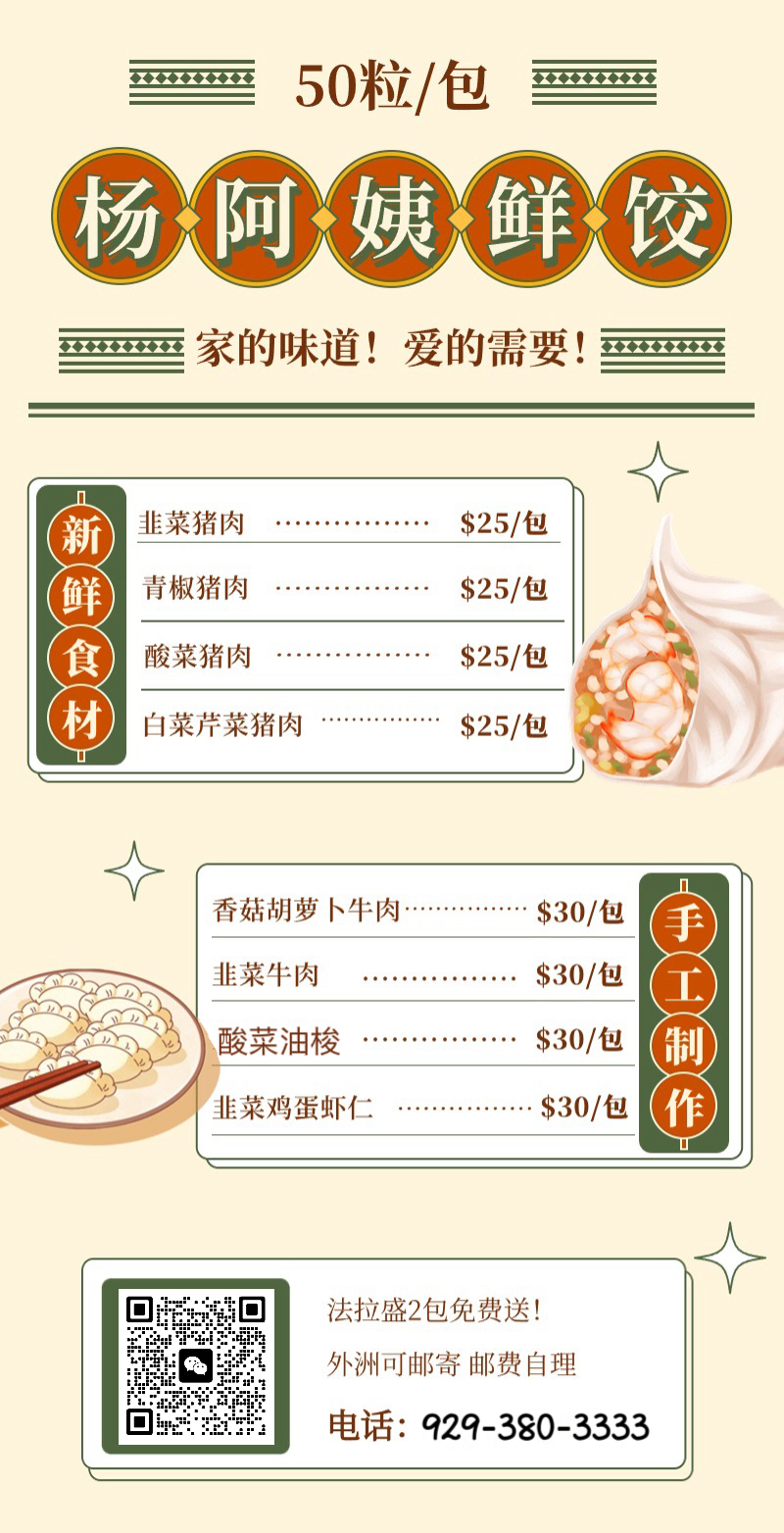 杨阿姨水饺.北方风味.皮薄馅大.品种多样.现包现卖!新鲜食材!只卖鲜饺!不卖冻饺.欢迎订购品尝,9293803333