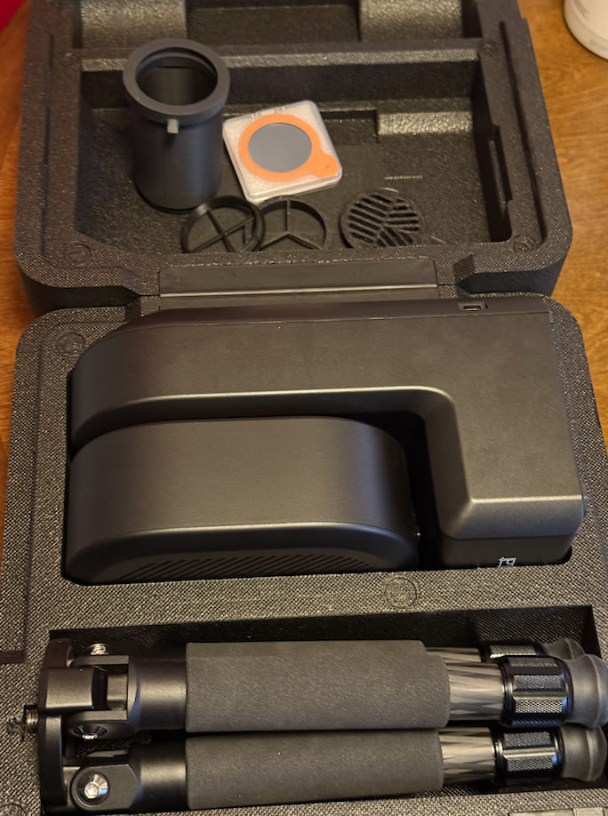 ZWO Seestar S50 智能天文望远镜,99新,箱说全,送防雾遮光罩,滤镜接环,对焦棱镜和星芒棱镜,$400。
