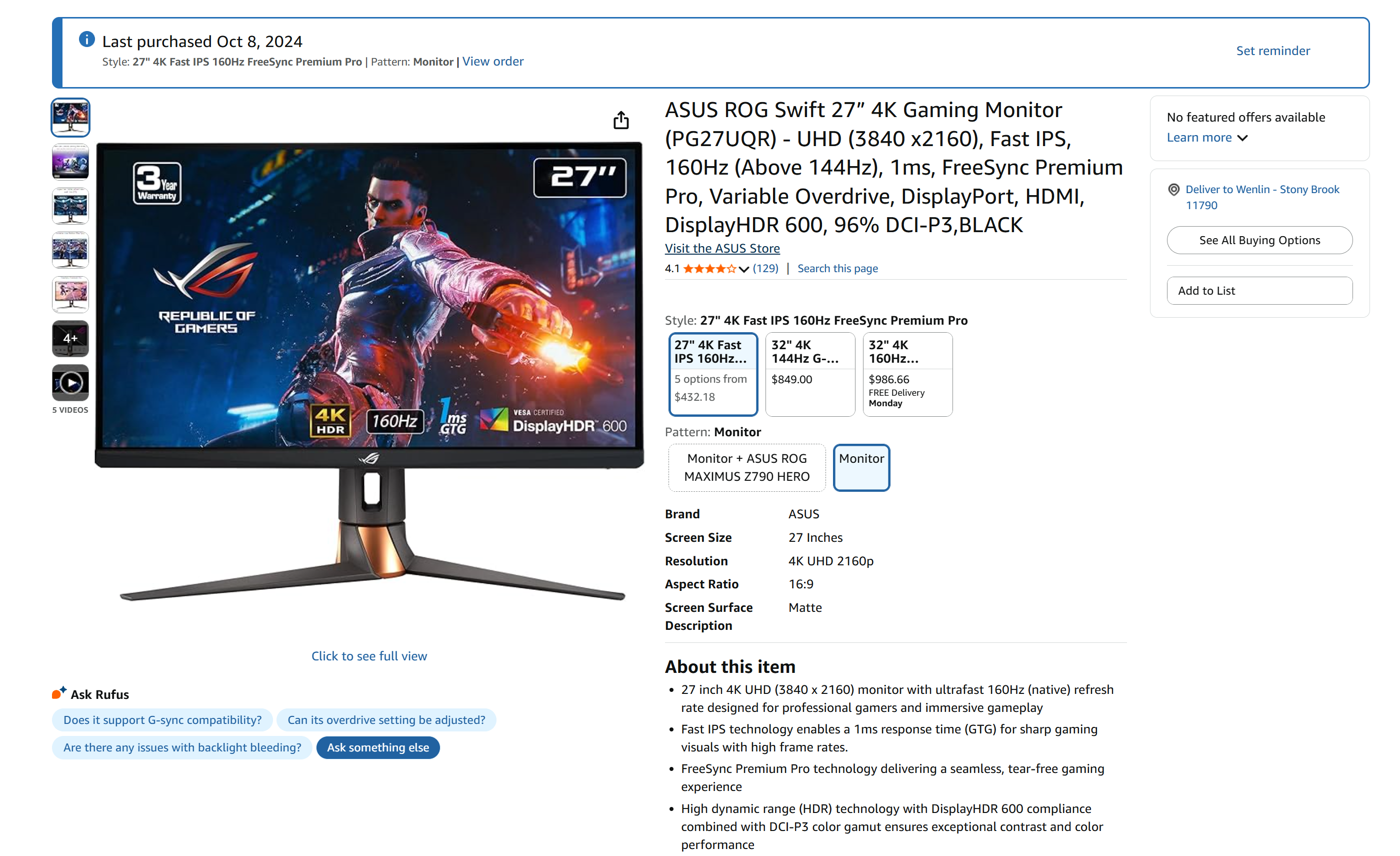 2. Asus ROG 27'' 4k 160hz HDR600 显示屏,同购买约半年, 品相完好,送HDMI线 360$购入 270$出售