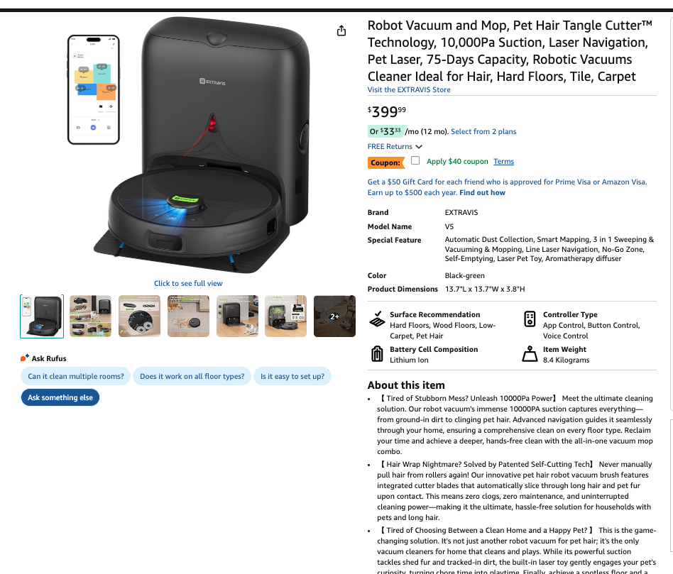 Robot Vacuum and Mop, Pet Hair Tangle Cutter™ Technology, 10,000Pa Suction, Laser Navigation, Pet Laser, 75-Days Capacity, Robotic Vacuums Cleaner Ideal for Hair, Hard Floors, Tile, Carpet