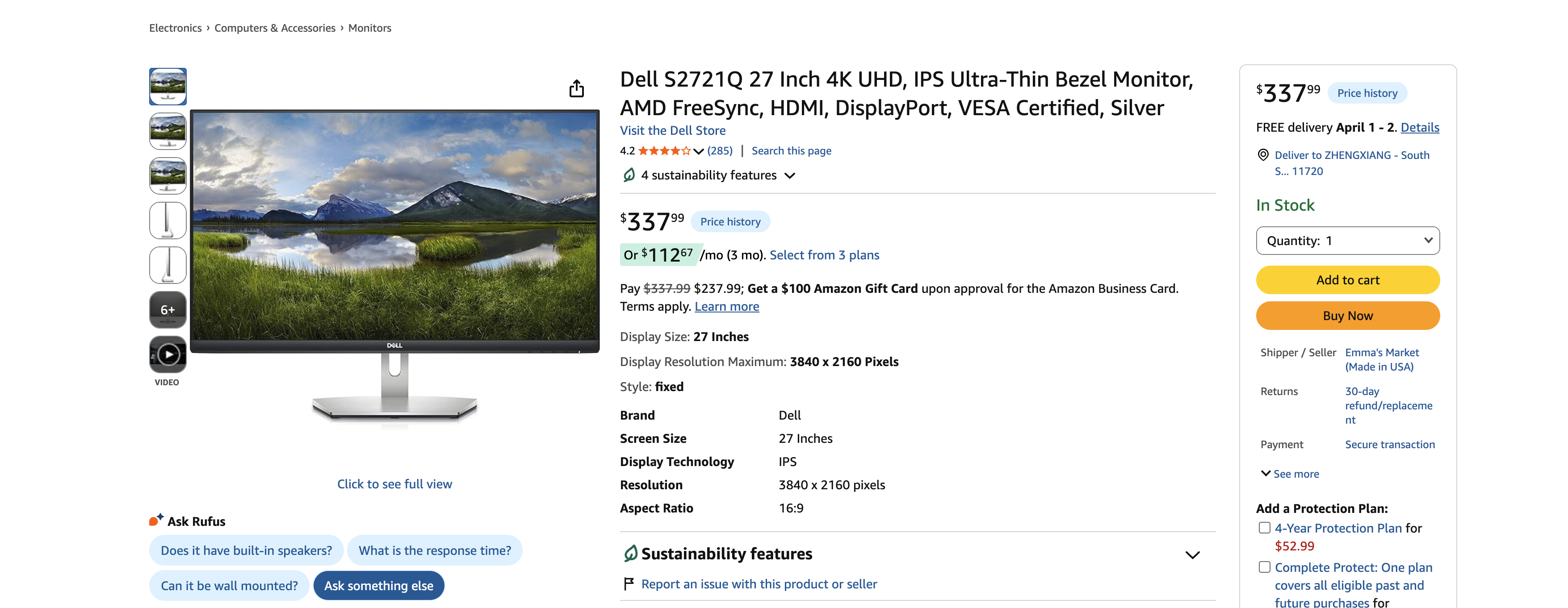配置详情可见:https://www.amazon.com/dp/B08DQWG3JG。同等配置最新款需要338刀:https://www.amazon.com/Dell-S2721Q-Ultra-Thin-DisplayPort-Certified/dp/B08DP756Z3?th=1。
