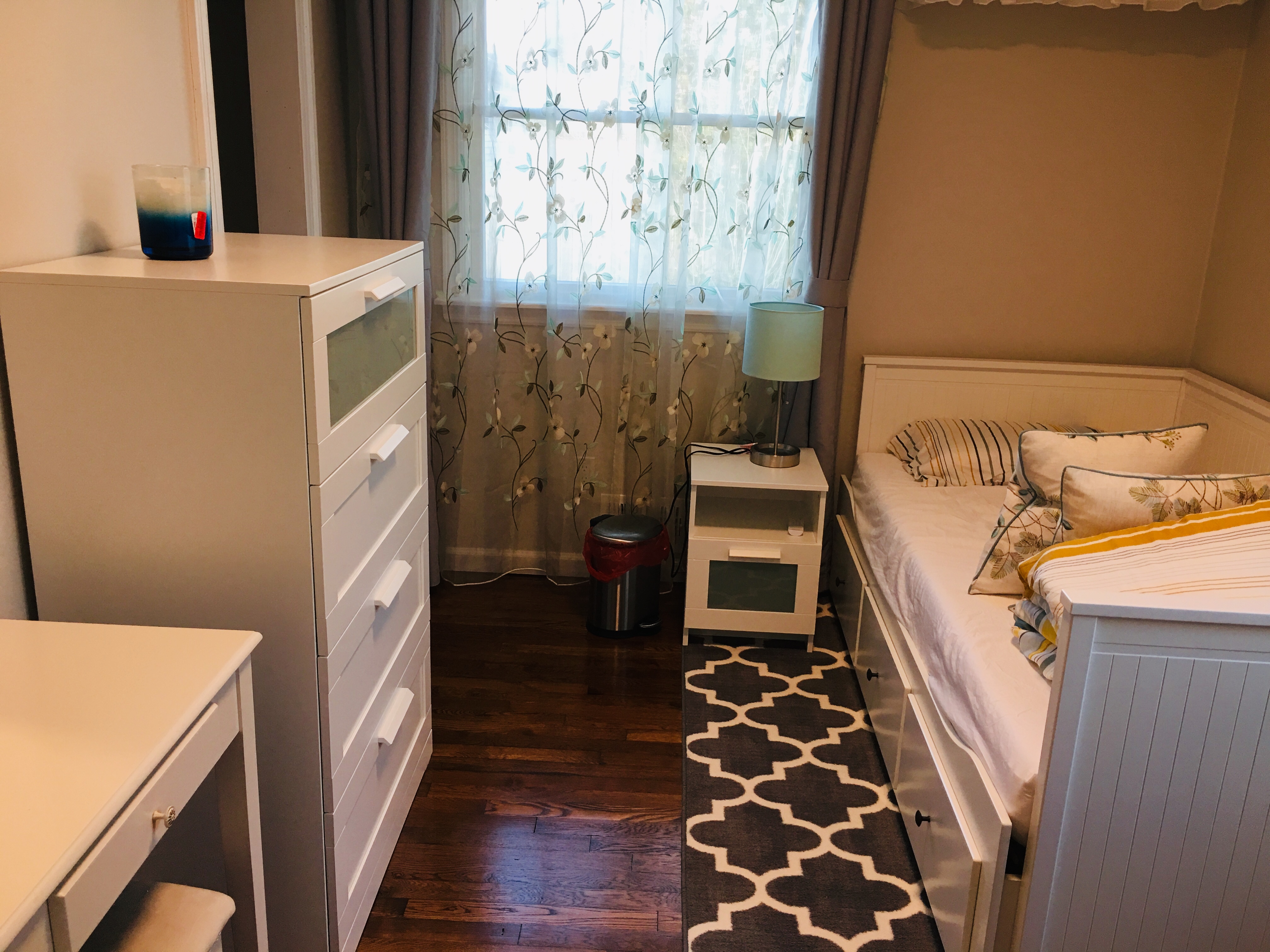 房子位于Centereach,离学校上下班时间开车10分钟,走路到Walmart、肯德基、健身房10分钟。新装修,一共有四个房间两个卫生间,现剩下一个单人房,整个房子只有四个人(包括现在即将招租的一个人),新买的洗衣机烘干机,小区特别安静。另一间房已有一个女生入住,现出租剩下的一个房间,房租:$650,包水和高速网络,煤气、电按人头平摊。半年起租