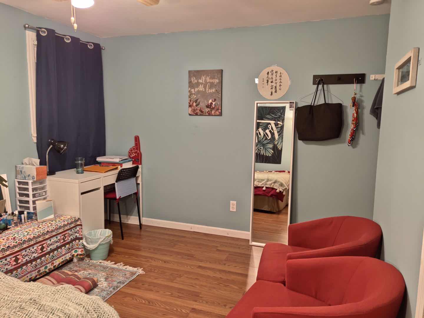 ,家具齐全,床书卓椅子,床头柜,衣橱及壁橱,冰箱,微波炉,烤箱,洗衣机,烘干机,停车方便,房子周围邻居有好,安全,安静适合学生入住,有需要的同学请联系6319536673