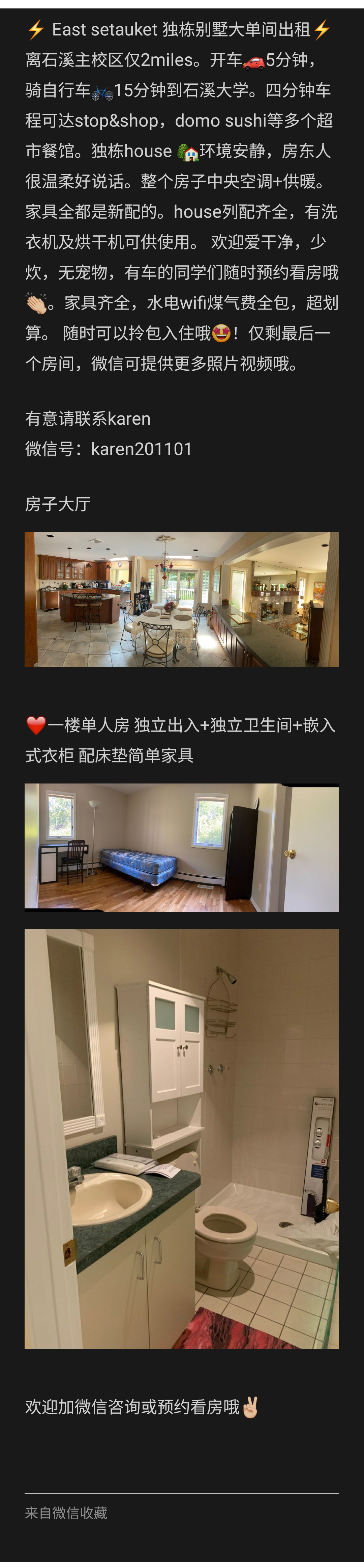一楼套间出租,带两个嵌入式衣柜,独立卫生间,独立出入。环境安静,楼上并无住户。离石溪主校区仅2miles。开车🚗5分钟,骑自行车🚲15分钟到石溪大学。四分钟车程可达stop&shop等多个超市餐馆。独栋house 🏡环境安静,房东人很温柔好说话。整个房子中央空调+供暖。家具全都是新配的。house列配有洗衣机及烘干机可供使用。 欢迎爱干净,少炊,无宠物的同学们随时预约看房哦👏🏻。家具齐全,水电wifi煤气费全包,超划算。 随时可以拎包入住哦🤩!可提供更多照片视频哦。