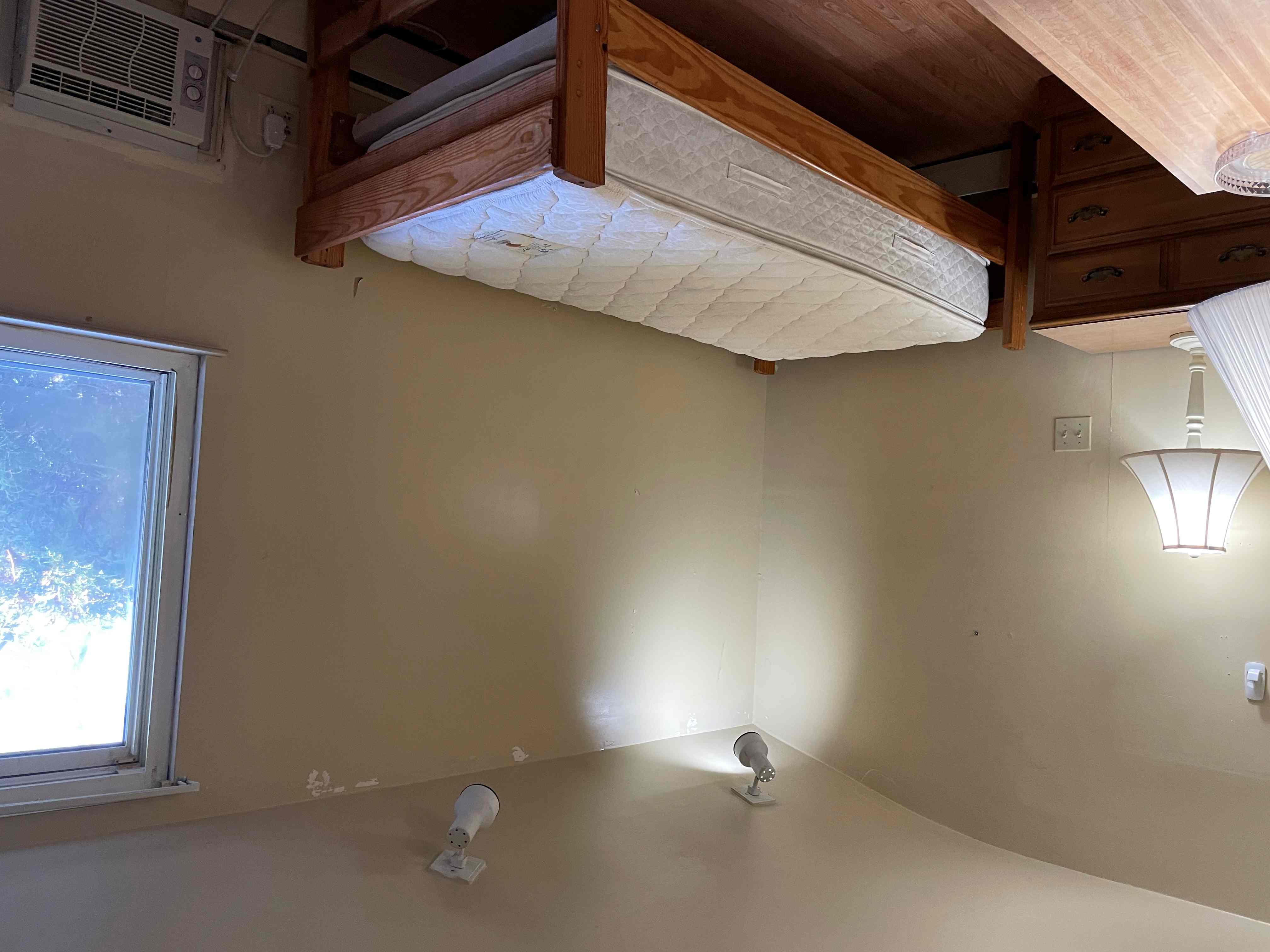 房間有多大窗戶。光線充足 房間家具有床 書桌 椅子. 燈,