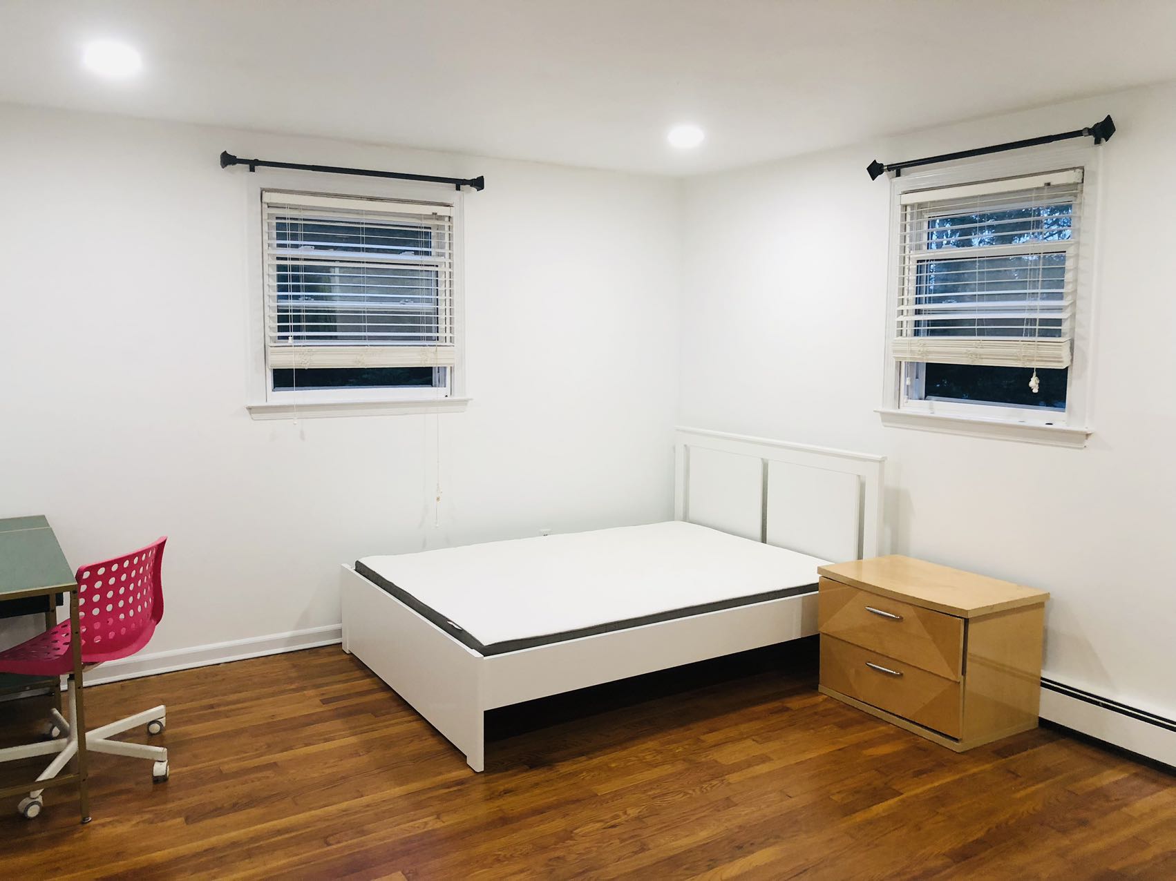 房子重新装修过,很整洁。每个单房都很大、自带两个walk-in 大衣厨;实木地板;多面窗,彩光、通风特别好。 每个房间配有全新双人床、床垫、床头柜、电脑桌、电脑桌。