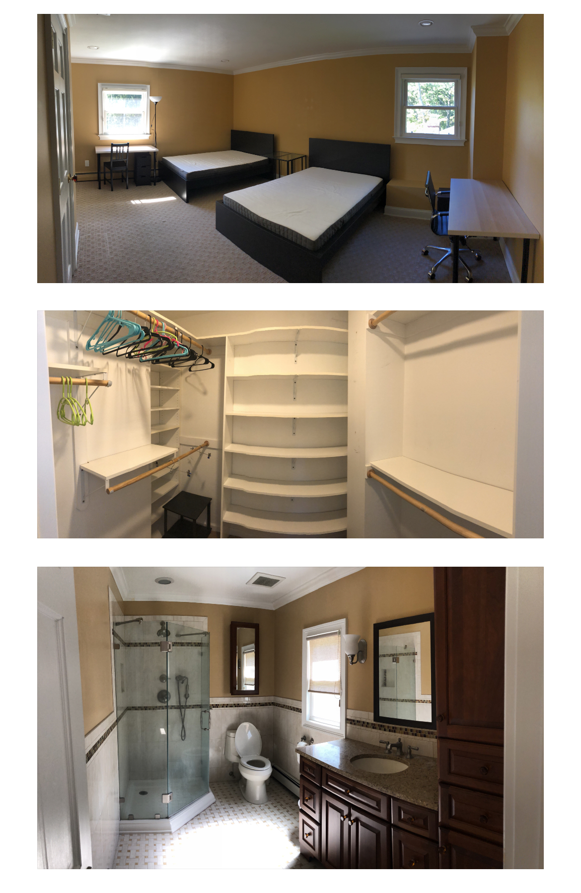 ✔️豪华双人间: full- size床➕独立卫浴➕walk-in closet➕提供书桌椅子柜子和小冰箱。